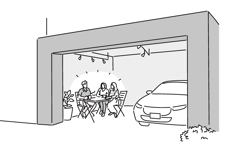 ガレージは様々な活用ができます。週末に友人を呼んでのんびりティータイムを過ごしたり、ちょっとしたワークショップを開いたり。プライベートな空間で有意義な過ごし方もできます。