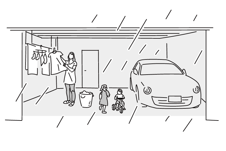 雨の日のお洗濯などの家事や、子どもと遊んだりするのもガレージだと安全です。テーブルを広げればちょっとしたパーティもできます。自由度の高いフリースペースとして趣味部屋にするのもおすすめです。