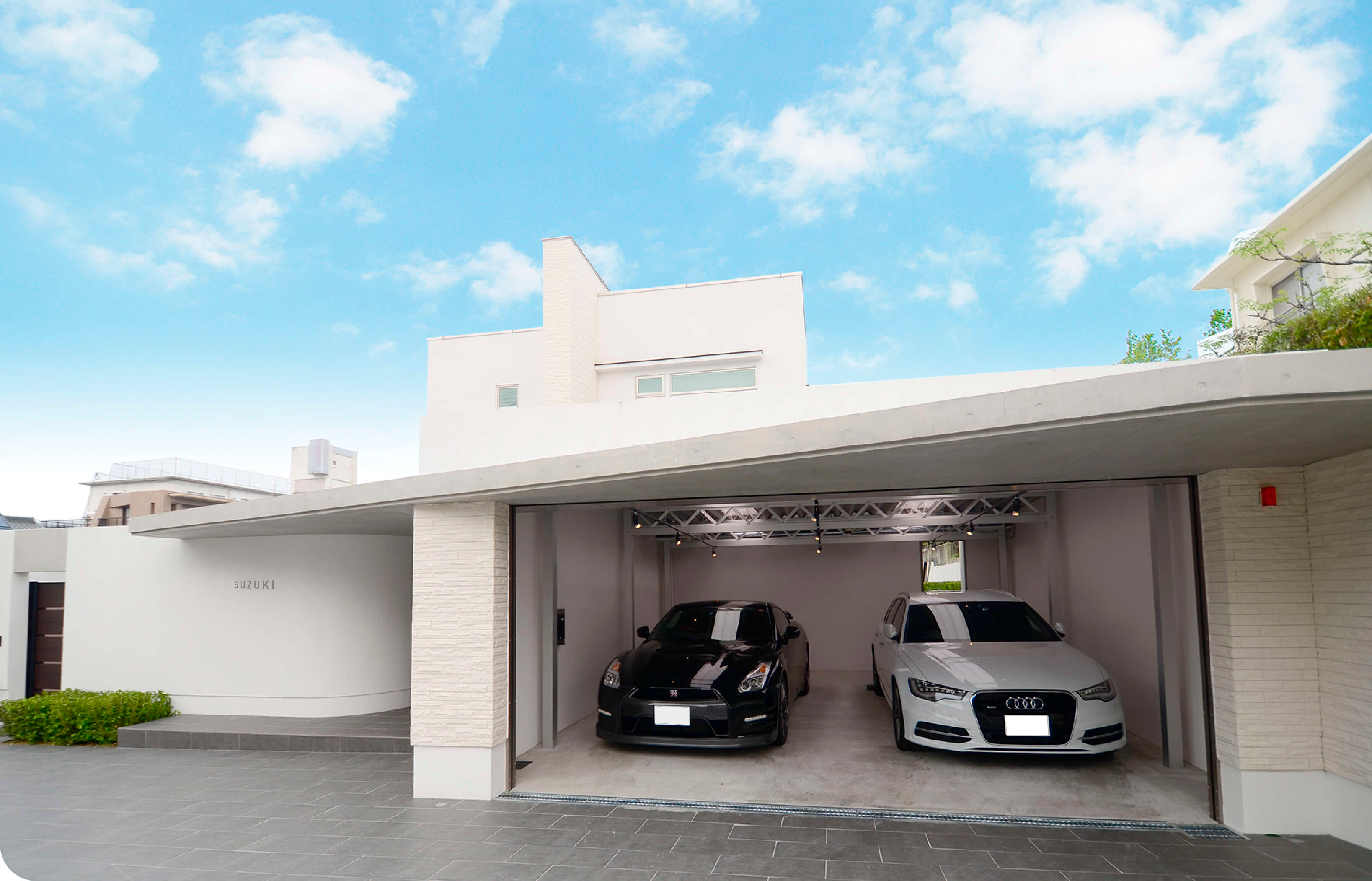 大切な愛車を護ることを前提にガレージは雨風や紫外線から車を守り、傷や塗装の劣化を防ぐ事ができます。さらにシャッターに鍵を付けたり、ガレージ内に防犯カメラを設置することで、より防犯性の高いガレージになります。盗難や車上荒らしなどの犯罪防止対策として効果があります。ガレージの本来の役割は大切な愛車を守ることにあります。自由度の高い設計力で、機能性とデザイン性を持ち合わせたスタイリッシュなガレージも可能です。